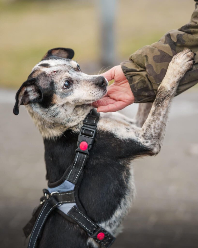 Teraz z radością czeka na spacery, nawołuje człowieka, uwielbia tarzanie się po trawie i co najpiękniejsze kocha przytulanie. Jest pełen energii, radosny i bardzo kontaktowy.